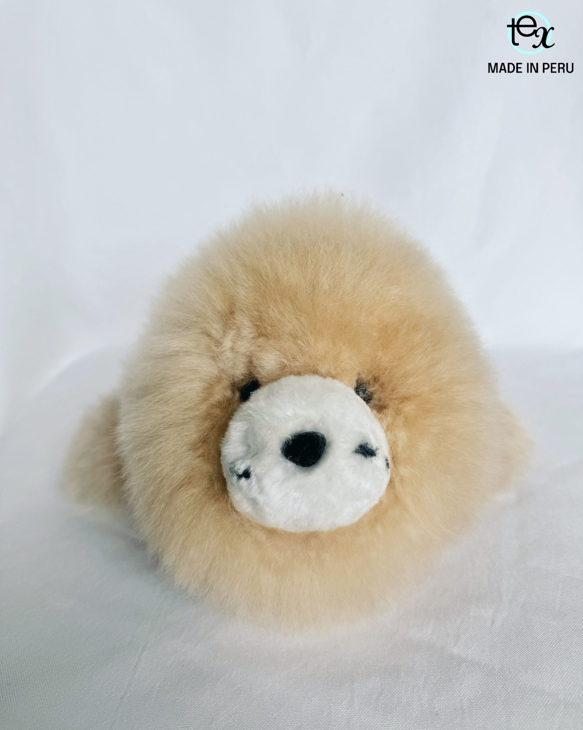 Fluffy Southern Sea Lion of 6″ height and 12″ total length, handmade in Peru with 100% Royal Alpaca Fur stuffed with synthetic cotton.